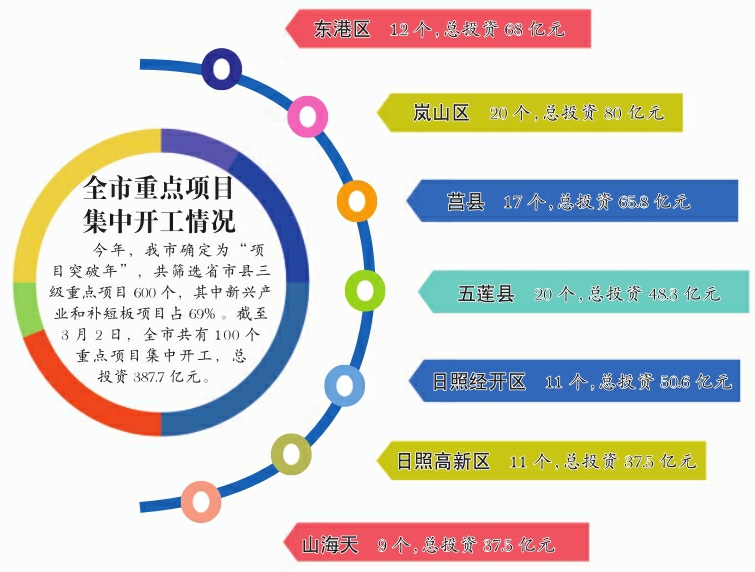 3月1日—2日,我市各區(qū)縣分別舉行重點項目集中開工活動,其中東港區(qū)12個項目開工,總投資68億元;嵐山區(qū)20個項目開工,總投資80億元;莒縣17個項目開工,總投資65.8億元;五蓮縣20個項目開工,總投資48.3億元;日照經(jīng)開區(qū)11個項目開工,總投資50.6億元;日照高新區(qū)11個項目集中開工,總投資37.5億元;山海天旅游度假區(qū)9個項目開工,總投資37.5億元。