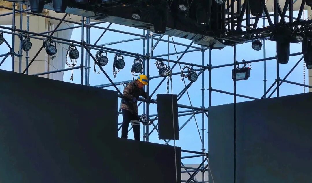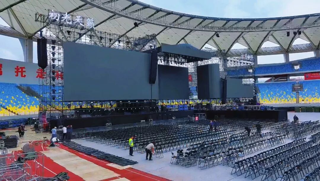 步入場館,最先抓住視線的便是闊大華麗的舞臺,目前,演唱會舞臺基礎框架與燈光、音響設備已基本搭建完畢,70米的整體長度橫跨場館中央,單是視覺上就足以帶來強烈的震撼。