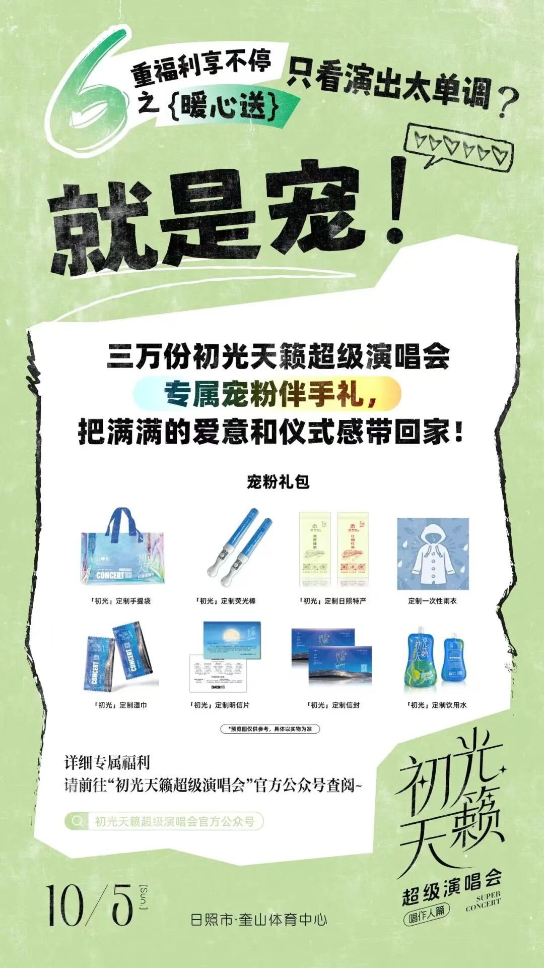 現場還為每位持票樂迷準備了一份心意滿滿的“寵粉禮包”,在定制的手提袋里,豐富的定制禮品專為這次演唱會打造,包括雨衣、日照特產、熒光棒、紙巾、明信片、信封、袋裝飲用水等,滿滿的愛意和儀式感,讓樂迷們把這次動人的記憶“打包”帶回家。