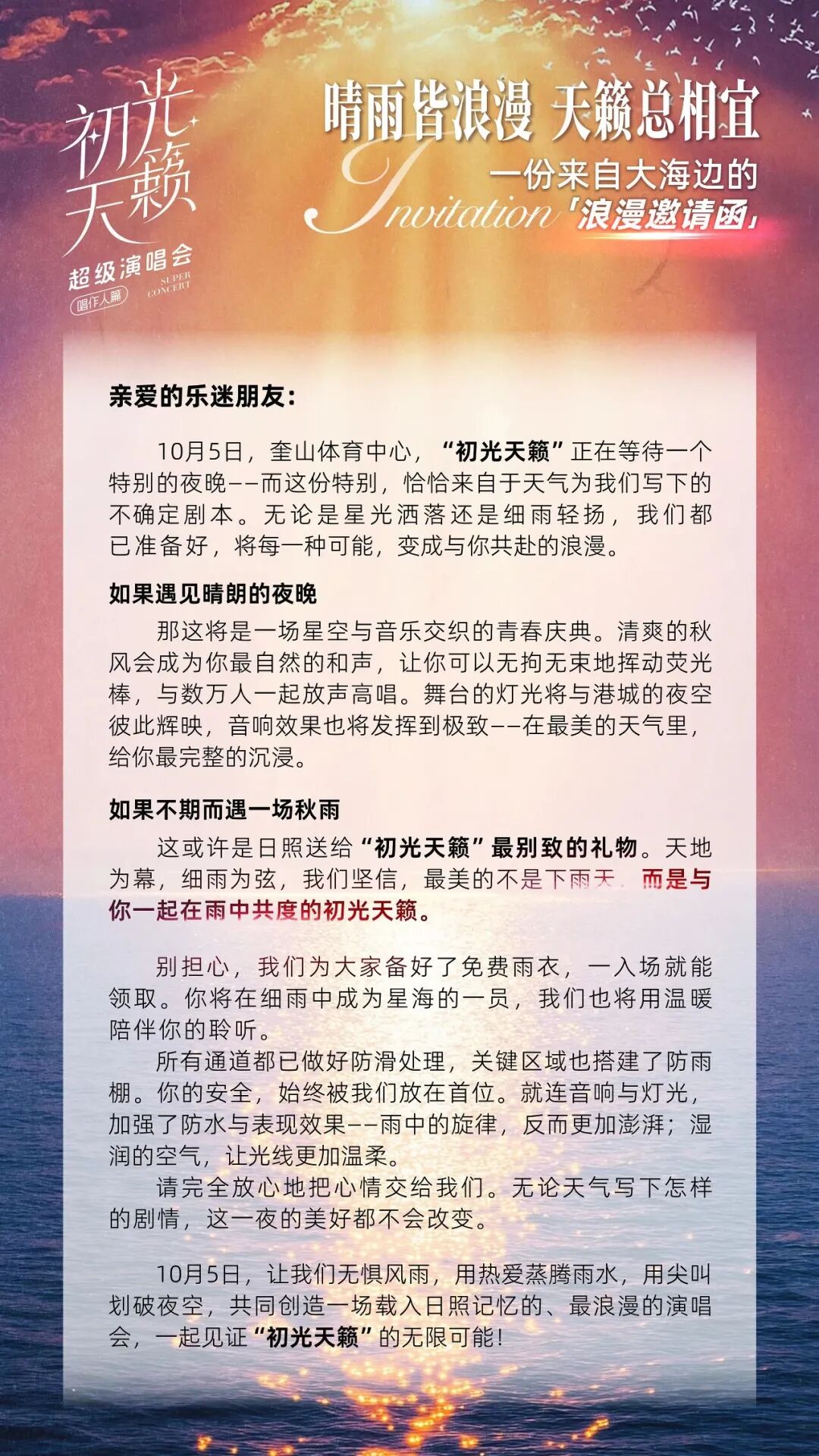 針對突發天氣情況,主辦方也做足了充分準備。根據天氣預報,10月5日夜晚或許會迎來一場秋雨,天氣情況為演出帶來了一種不確定性,但這種不確定性,恰恰為演唱會增添了一份獨特的浪漫。若是晴夜,這將是一場星空與音樂交織的青春盛典,清爽的秋風將成為最自然的和聲;倘若遇雨,那便是天地為幕、細雨為弦的別樣體驗,與數萬人共度雨中的音樂時光,必將成為難忘的記憶。