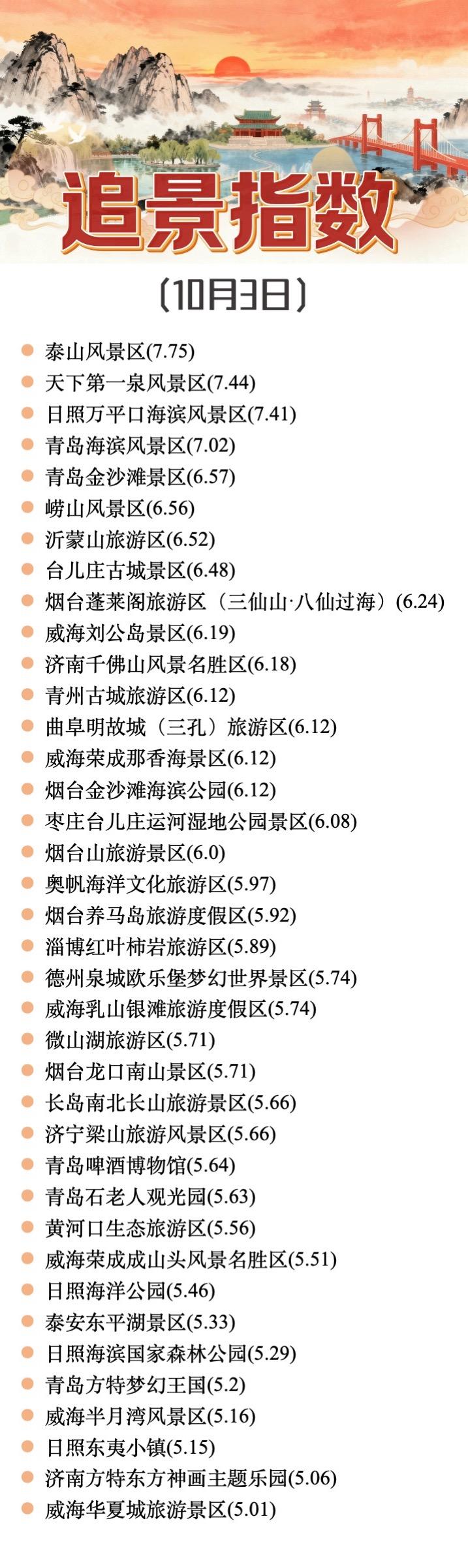 “國慶假期追景指數”顯示,10月3日,山東40個熱點景區的 “追景指數”均值為5.92,較上一日上升2.78%。排名前3位的分別是泰山風景區、天下第一泉風景區、日照萬平口海濱風景區, “追景指數”分值分別為7.75、7.44、7.41。