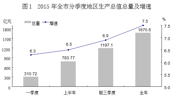 經(jīng)濟(jì)總量邁上新臺(tái)階。2015年,全市上下積極應(yīng)對(duì)經(jīng)濟(jì)下行壓力,國(guó)民經(jīng)濟(jì)在穩(wěn)增長(zhǎng)、調(diào)結(jié)構(gòu)、促發(fā)展和改革創(chuàng)新中實(shí)現(xiàn)企穩(wěn)回升。初步核算并經(jīng)省統(tǒng)計(jì)局審核反饋,全市實(shí)現(xiàn)地區(qū)生產(chǎn)總值(GDP)1670.8億元,是“十一五”末的1.63倍,按可比價(jià)格計(jì)算,比上年增長(zhǎng)7.5%,“十二五”期間年均增長(zhǎng)10.4%。全年完成第一產(chǎn)業(yè)增加值140.6億元,比上年增長(zhǎng)4.0%,第二產(chǎn)業(yè)增加值813.06億元,增長(zhǎng)8.0%,第三產(chǎn)業(yè)增加值717.14億元,增長(zhǎng)7.4%。其中,一季度GDP增長(zhǎng)6.3%,上半年增長(zhǎng)6.5%,前三季度增長(zhǎng)6.9%,全年增長(zhǎng)7.5%,呈現(xiàn)逐季回升態(tài)勢(shì)。人均地區(qū)生產(chǎn)總值58110元,按年平均匯率折算達(dá)到9330美元,比上年增長(zhǎng)6.9%,是“十一五”末的1.58倍,年均增長(zhǎng)9.6%。規(guī)模以上工業(yè)增加值達(dá)到586.9億元,“十二五”年均增長(zhǎng)12.0%。五年累計(jì)完成固定資產(chǎn)投資5514.68億元、實(shí)際到賬外資24.82億美元,年均分別增長(zhǎng)18.6%、11.7%。社會(huì)消費(fèi)品零售總額達(dá)到603.87億元,是“十一五”末的1.94倍。一般公共預(yù)算收入由55.61億元增加到121.65億元,五年翻了一番多。港口貨物吞吐量、集裝箱吞吐量分別達(dá)到3.61億噸、281.34萬(wàn)標(biāo)箱,分別是“十一五”末的1.59倍、2.65倍,均實(shí)現(xiàn)歷史性跨越。金融機(jī)構(gòu)本外幣存款余額達(dá)到1872.35億元,是“十一五”末的1.87倍。