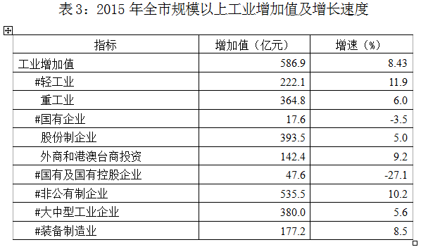 工業生產平穩運行。年末全市規模以上工業企業624家,其中主營業務收入過百億元的5家。實現規模以上工業增加值586.9億元,增長8.43%。全市33個工業行業大類中,有20個行業實現增長,增長面為60.6%。規模以上工業分三大門類看,采礦業增加值增長7.3%,制造業增長8.9%,電力、熱力、燃氣及水的生產和供應業下降1.0%。