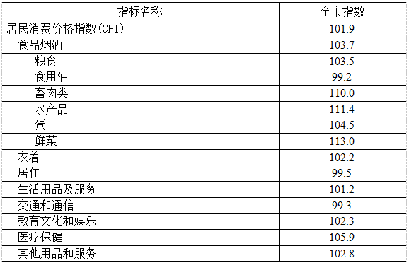 物價水平溫和上漲。居民消費價格總水平上漲1.9%,比全國、全省低0.10.2個百分點。八大類消費品“六升兩降”。其中,食品煙酒、衣著、生活用品及服務、教育文化和娛樂、醫療保健、其他用品和服務價格分別上漲3.7%2.2%1.2%2.3%5.9%2.8%;居住、交通和通信價格分別下降0.5%0.7%。工業生產者出廠價格上漲4.3%,工業生產者購進價格上漲0.3%,漲幅比上年擴大137.7個百分點。