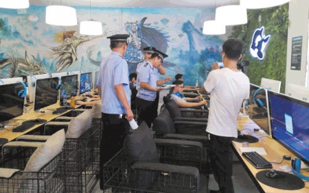 眼下正值暑期,為給廣大青少年打造一個健康文明的“綠色暑假”,東港區綜合行政執法局對網吧、電影院等文化娛樂場所進行嚴查嚴控,營造暑期高壓監管態勢,保障了未成年人的身心健康和合法權益。 (本報記者 姚彩虹 通訊員 王雪凝 攝)