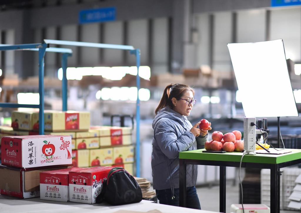 2022年10月10日,洛川縣一家果品企業的工作人員在倉庫進行線上直播。新華社記者 張博文 攝