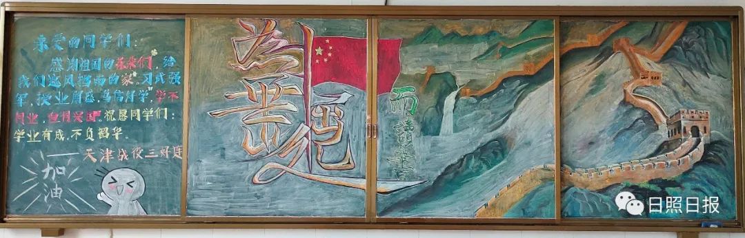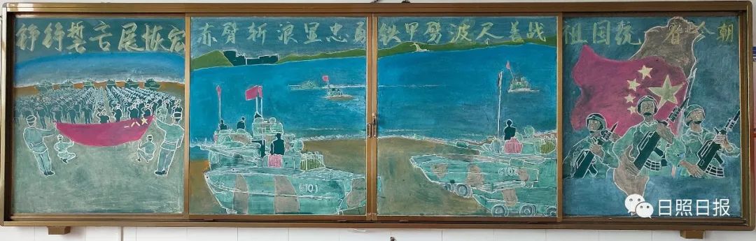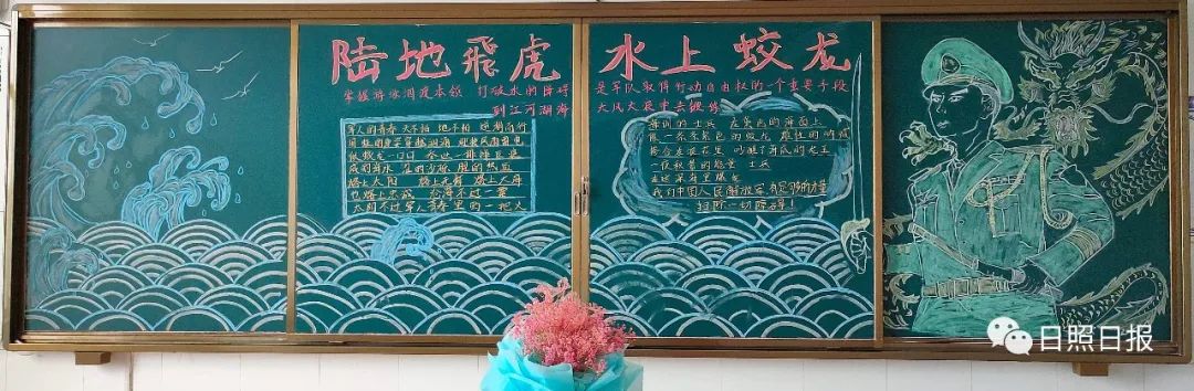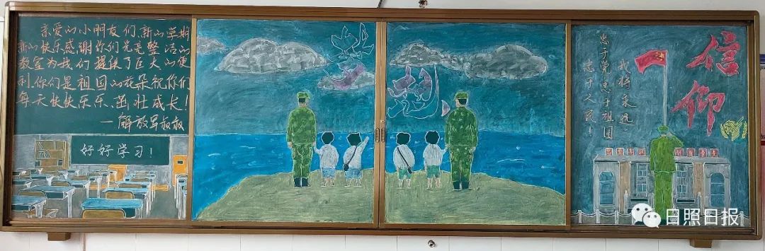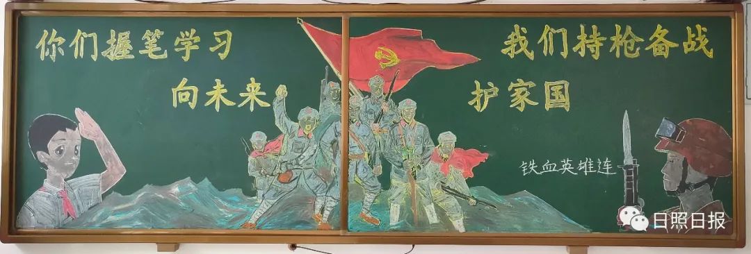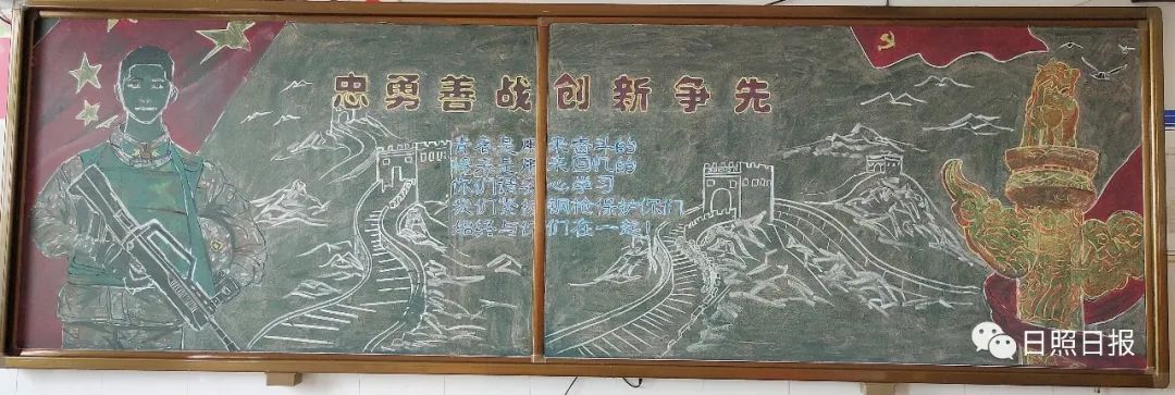 在開學前夕,某駐軍部隊在駐龍山小學完成軍事訓練后,不僅將每間教室、每處角落都收拾得干干凈凈,物品擺放得整整齊齊,還給全校師生留下了一份特殊的“大禮”——一幅幅形象生動、令人肅然起敬的黑板報。