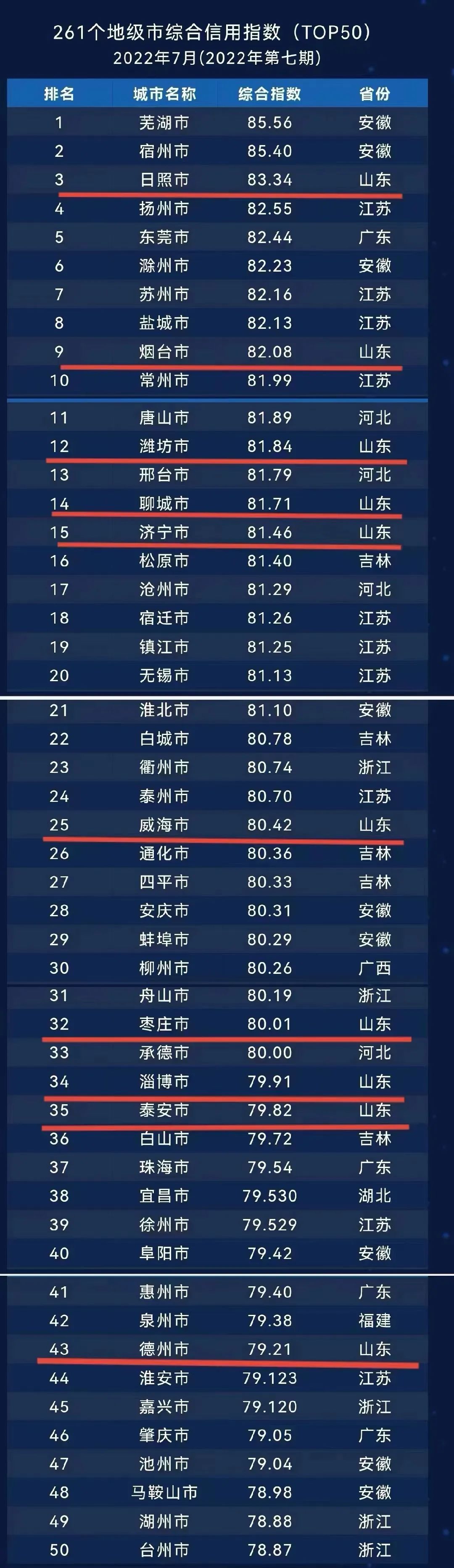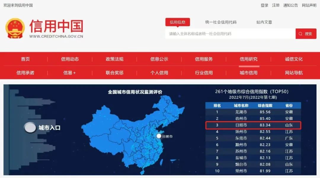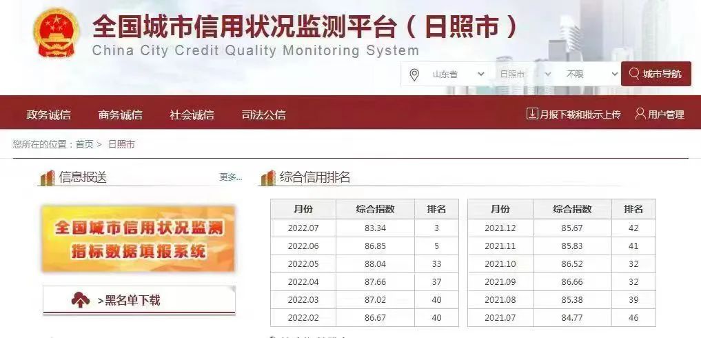 日照市綜合信用排名情況